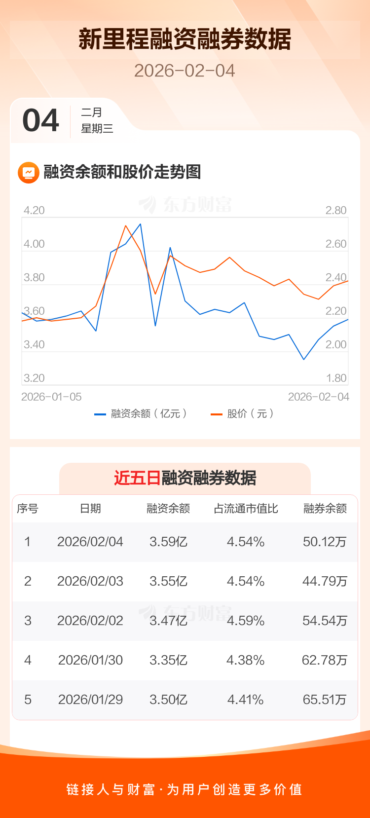交易所最新数据显示,新里程于2026年2月4日获融资买入2393.45万元,融资偿还1981.39万元,当日融资净买入412.07万元。目前,该股融资余额3.59亿,占流通市值比例为4.54%。