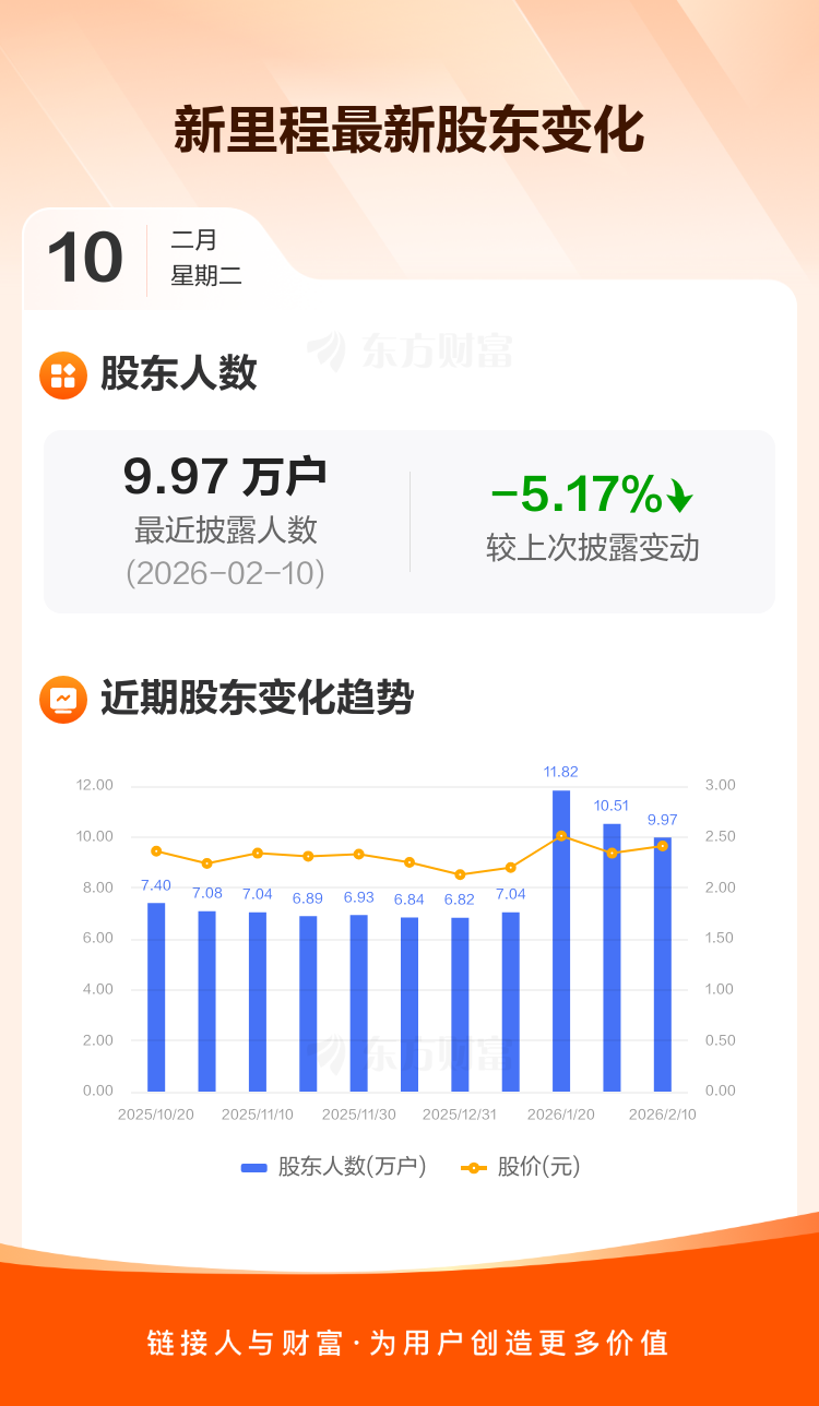 新里程最新披露数据显示,截至2月10日公司股东户数为9.97万户,较上期(2026年1月30日)减少5435户,降幅为5.17%。户均持有流通股数量由上期的3.11万股上升至3.28万股,户均持股金额由上期的7.28万元增加至7.91万元。