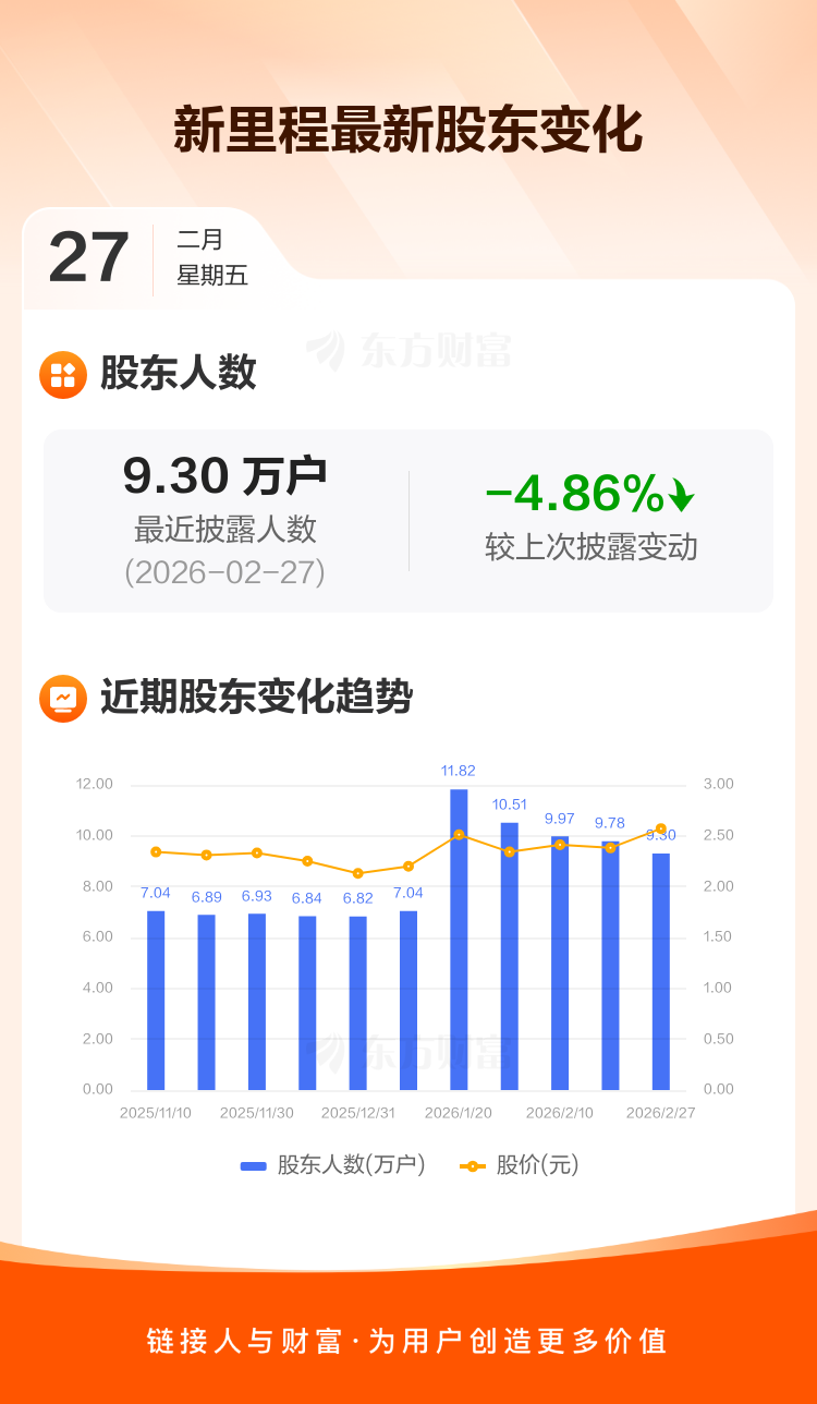新里程最新披露数据显示,截至2月27日公司股东户数为9.30万户,较上期(2026年2月13日)减少4747户,降幅为4.86%。户均持有流通股数量由上期的3.35万股上升至3.52万股,户均持股金额由上期的7.97万元增加至9.04万元。