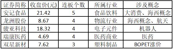 从连板情况来看,今日首板个股有48只;2连板的个股有20只;3连板及以上的个股有6只。今日连板数排名前5的个股包括安记食品、龙洲股份、骏亚科技、瑞康医药、双星新材,具体如下表所示。