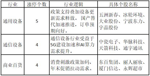 从行业特征来看,今日涨停板个股中,通用设备、通信设备、商业百货行业的个股最多。