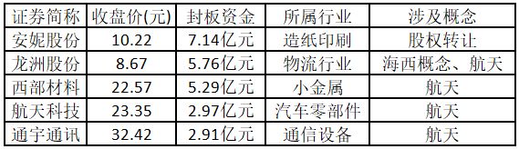 从概念特征来看,今日涨停板个股中,海西概念、航天、大消费概念的个股最多。