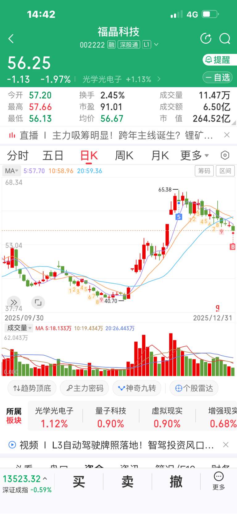 $福晶科技(SZ002222)$ 64元之上卖出的三成仓位今天补回一成