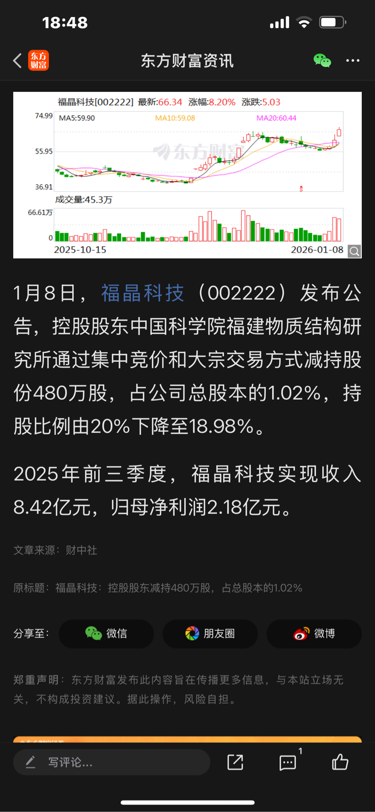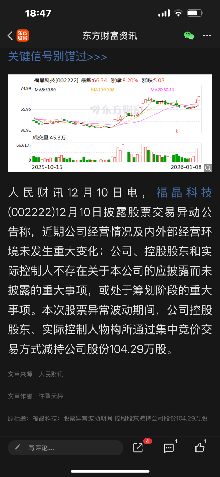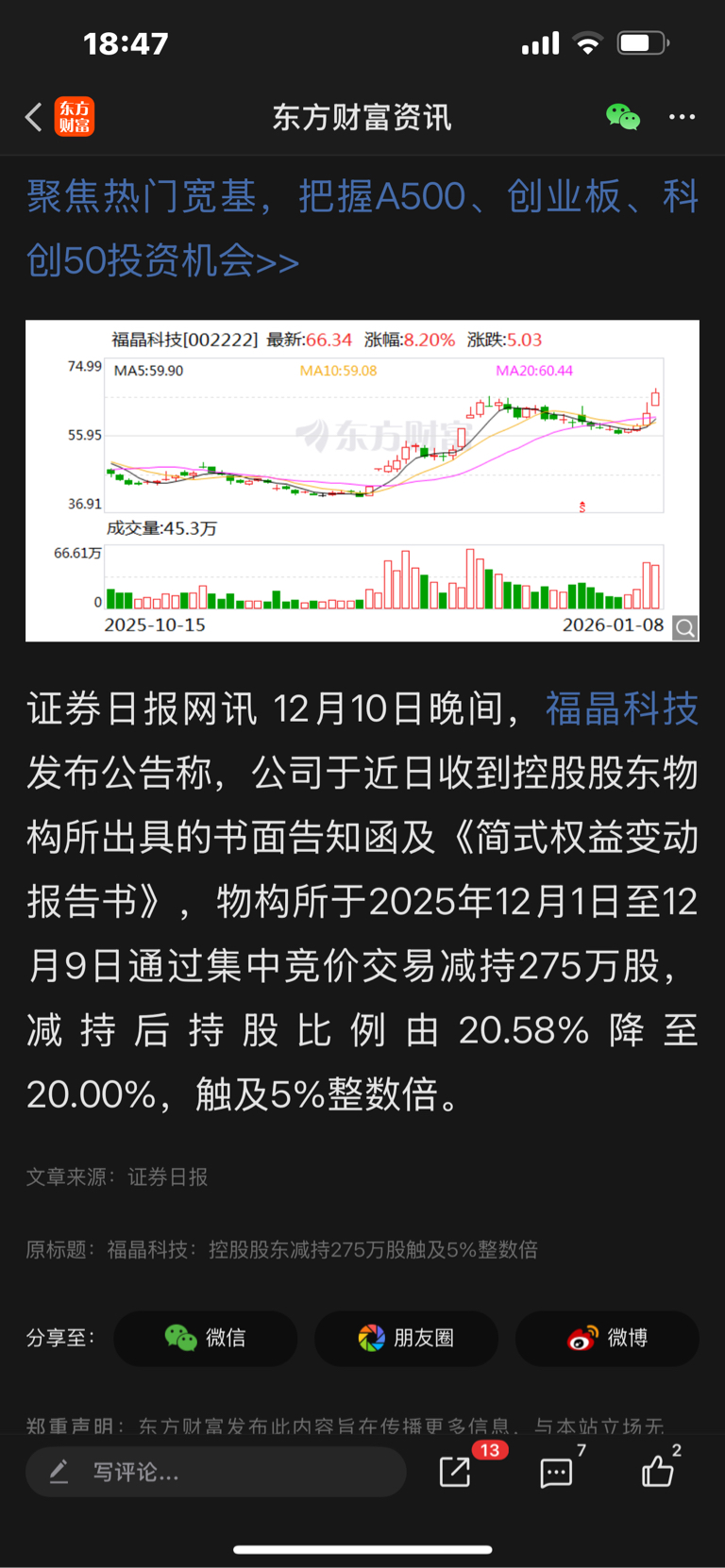 $福晶科技(SZ002222)$ 480万+275万+104.29万到7号一共减持859.25万股今天减持40万股,实际减持了900万股