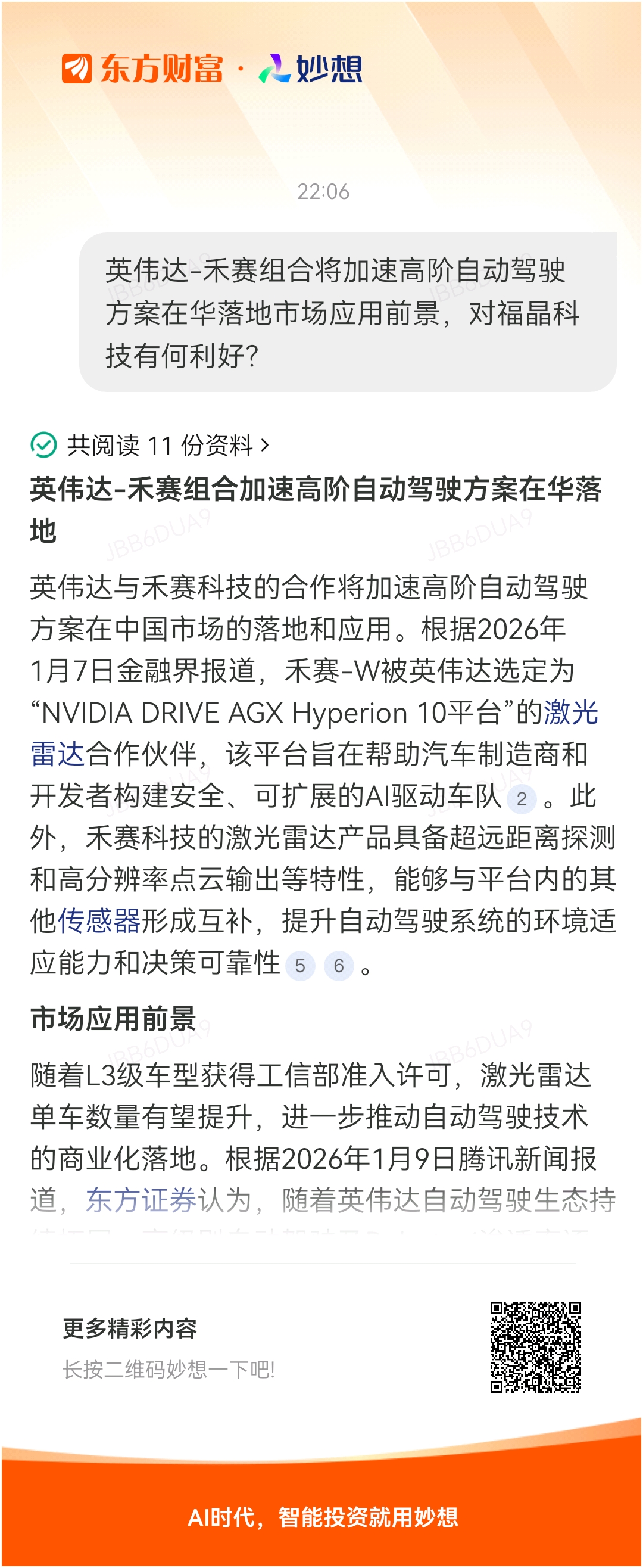 #@妙想,你怎么看?# 妙想一下:英伟达-禾赛组合将加速高阶自动驾驶方案在华落地市场应用前景,对福晶科技有何利好?$福晶科技(SZ002222)$