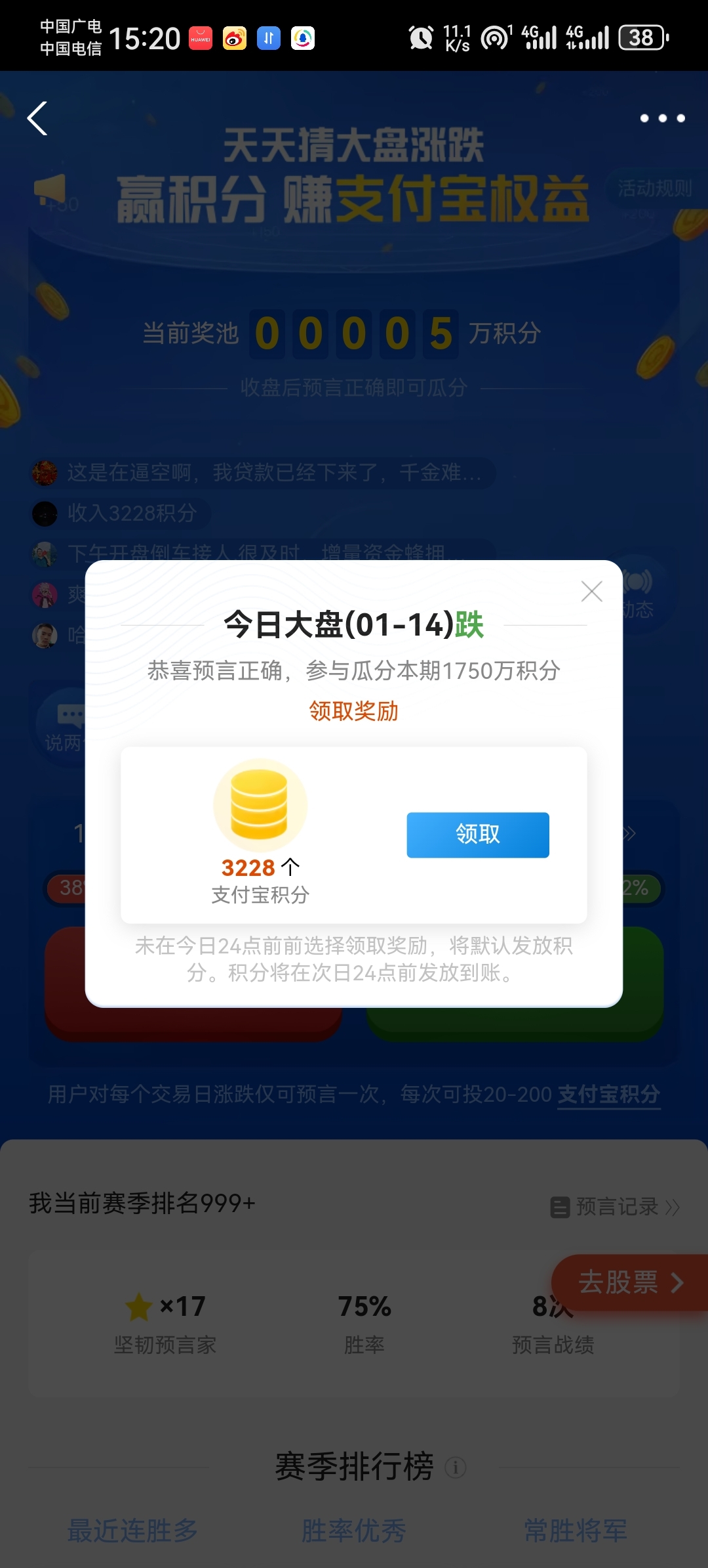 $福晶科技(SZ002222)$ 虽然我看好福晶科技、华工科技后市,但不能排除我短线看空大盘。周一预判周二开始调整,没想到周三上午再创新高收盘。中午在支付宝猜股票涨跌处压200积分看跌,下午开盘果然大幅杀跌,200积分收益3228积分,收益达16倍,可算意外之喜!