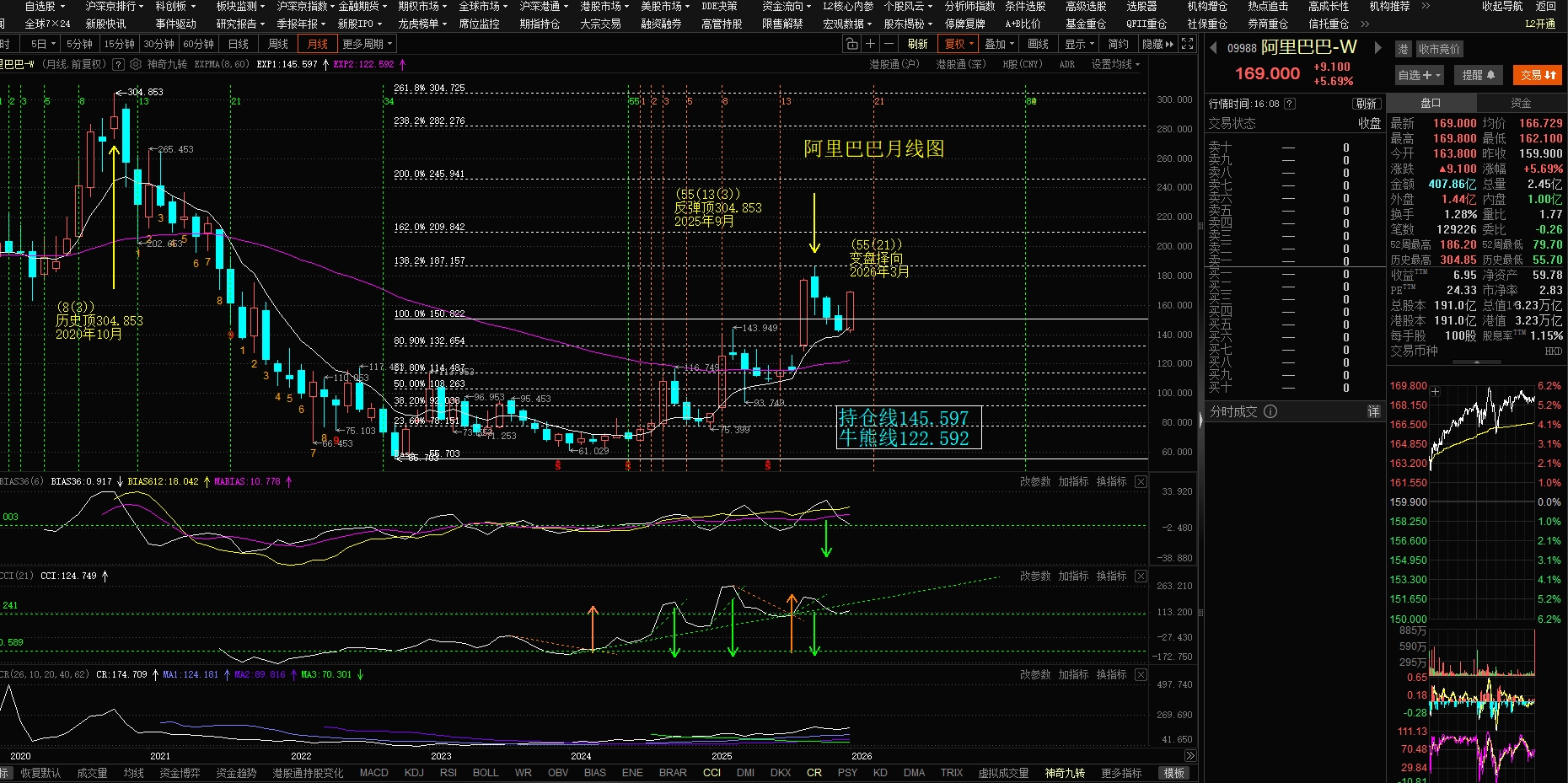 看图说话,阿里巴巴月线图:历史记录历史顶和反弹顶严格遵守斐波那契数列变盘,本月仅属反弹,短线未扭转卖出信号,建议观望到3月双代会行情(每年都有一小波反弹),如调整到黄金分割位100%150.822左右小量建仓。下周美股进变盘择向,下周周线走至上升九转K9,是否升势尽头?今晚变盘敏感日择向值得关注!道指跌破日持仓线49154.7,将给下周带来调整前兆。因为中短线能量顶背离下降! //@股海翱翔55 :近一年,下跌个股超千只,12月收阴2420只,今年1月收阴或0升幅850只,踏空了吗?“易中天”连调13~15至24个交易日,踏空了吗?绩优股腰斩-45.44%,踏空了吗?近四年,你在ETF基金尝腰斩,好了伤疤忘了疼,至今仍有268只ETF基金1元面值以下,选基选股看技术!踏空了吗?