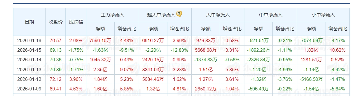 从1月9号到1月16号,主力近5亿的资金进入,股价从69.41升到70.57,主