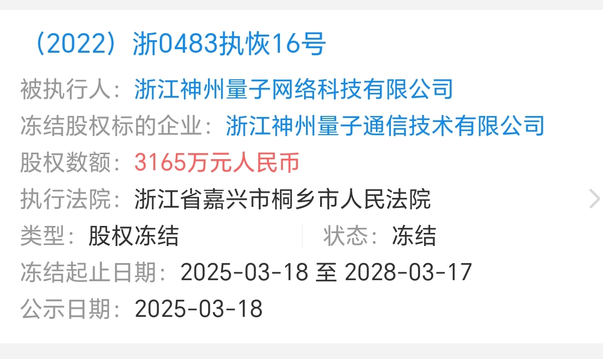$三 力 士(SZ002224)$ 网上说三力士和彭顷砡(前国科大老师现已退休)的合作早已终止,合作公司已全部注销,浙江神州量子网络公司因为有股权拍卖和债务纠纷没有解决,还无法注销,但公司早已经没有任何实质性运营。况且彭顷砡已经六十多岁,即便再合作,也很少有量子科技研究进展了,以上信息不知具体啥情况啊