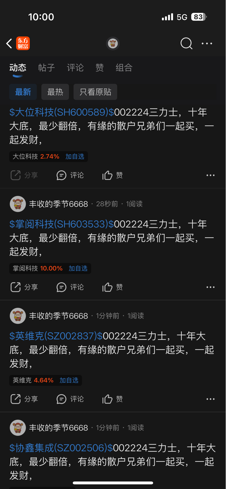 温馨提示: 1.根据《证券法》规定,禁止编造、传播虚假信息或者误导性信息,扰乱证券市场;2.用户在本社区发表的所有资料、言论等仅代表个人观点,与本网站立场无关,不对您构成任何投资建议。用户应基于自己的独立判断,自行决定证券投资并承担相应风险。《东方财富社区管理规定》