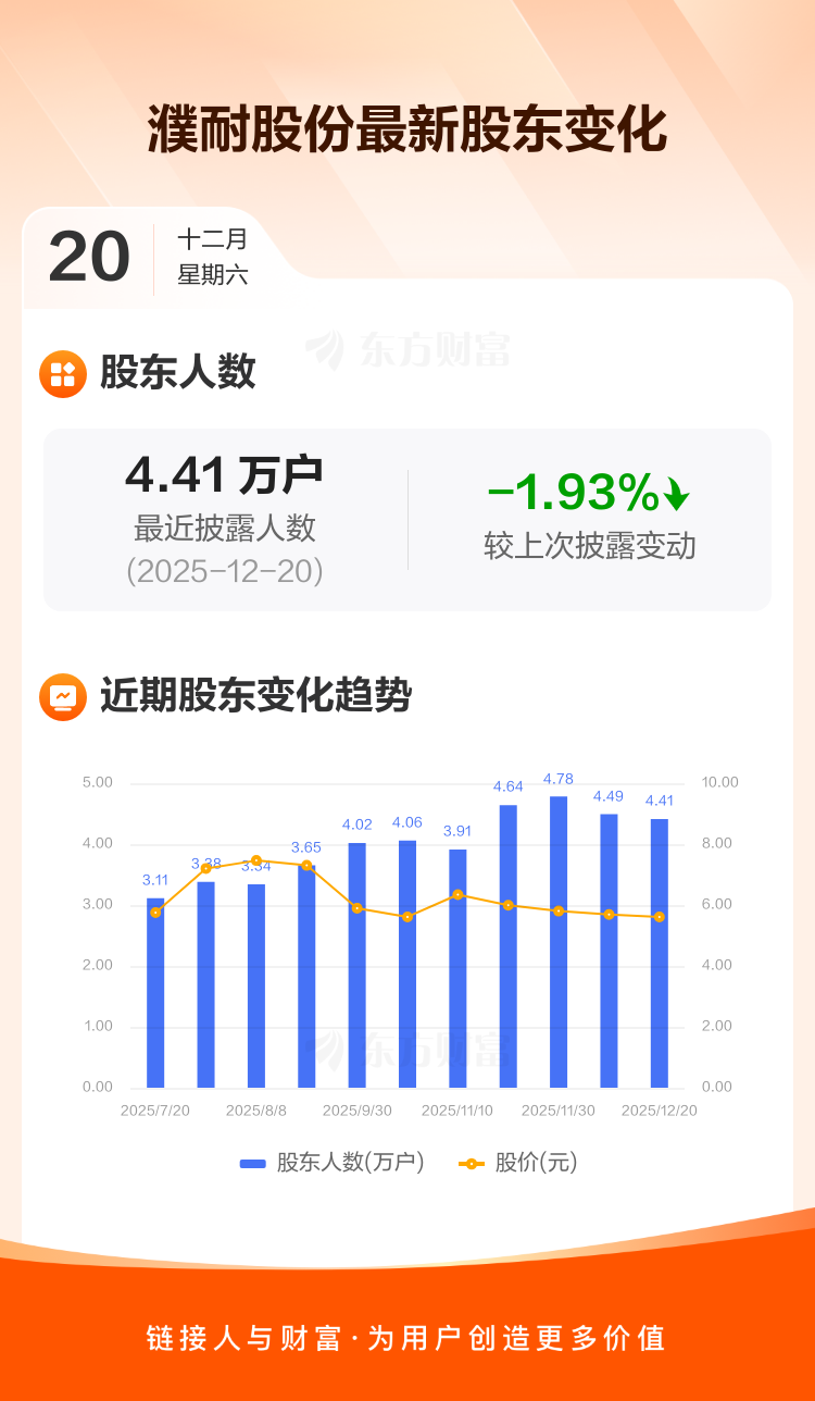 濮耐股份最新披露数据显示,截至12月20日公司股东户数为4.41万户,较上期(2025年12月10日)减少866户,降幅为1.93%。户均持有流通股数量由上期的2.17万股上升至2.21万股,户均持股金额由上期的12.33万元增加至12.40万元。