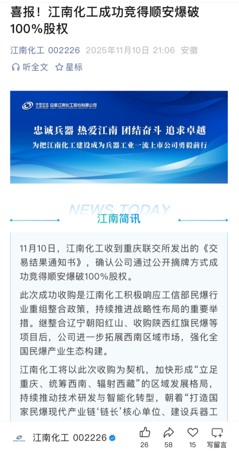$江南化工(SZ002226)$ 公告有公告的规矩,喜报有喜报的想法