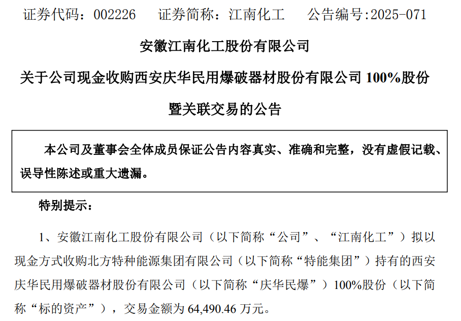 12月5日晚间,江南化工(002226)同步披露两起民爆资产交易,公司拟“左右开弓”关联收购西安庆华民用爆破器材股份有限公司(以下简称“庆华民爆”)100%股份,并拟公开摘牌抚矿十一厂民爆资产。