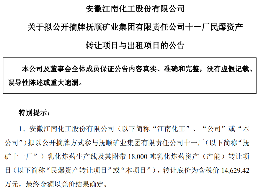12月5日晚间,江南化工公告称,拟以公开摘牌方式参与抚顺矿业集团有限责任公司十一厂(简称“抚矿十一厂”)民爆资产转让与物业出租捆绑项目,两项目竞价起始价合计19,928.92万元,资金来源为公司自有资金。