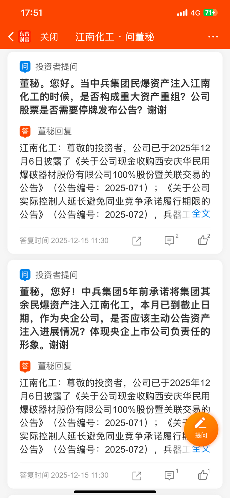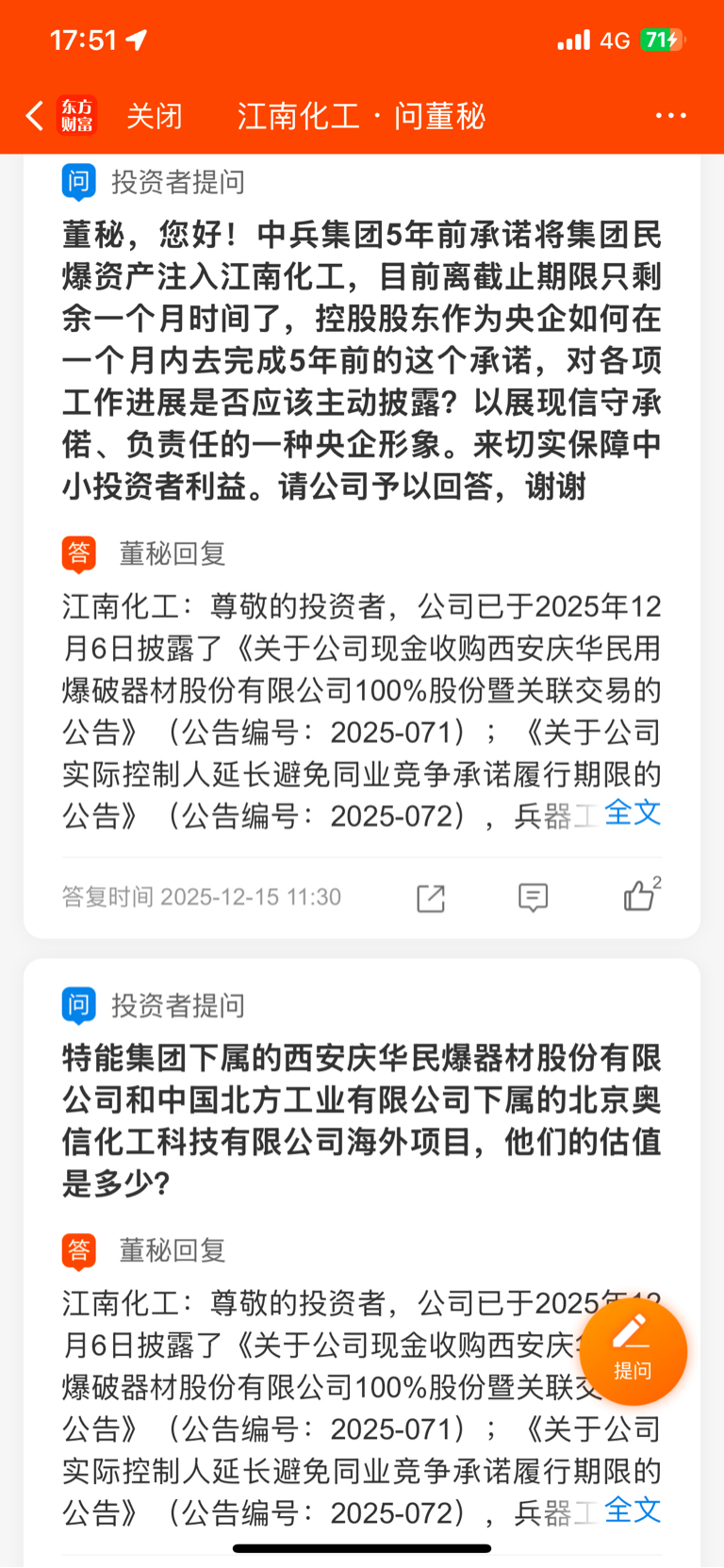 4个不同的问题,4个完全相同的回答,连字数和标点符号都一样,只会复制粘贴的董秘
