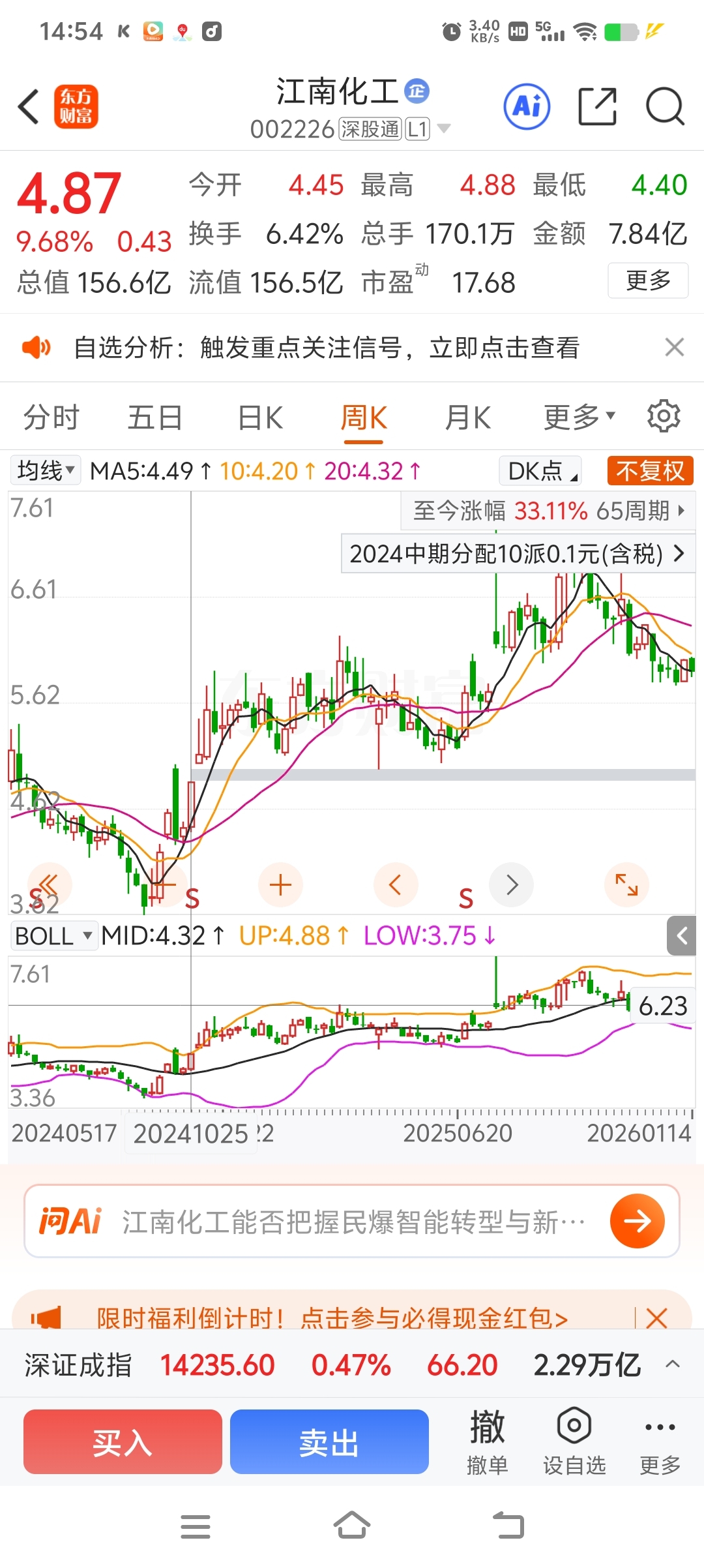 $江南化工(SZ002226)$ 到4.88元