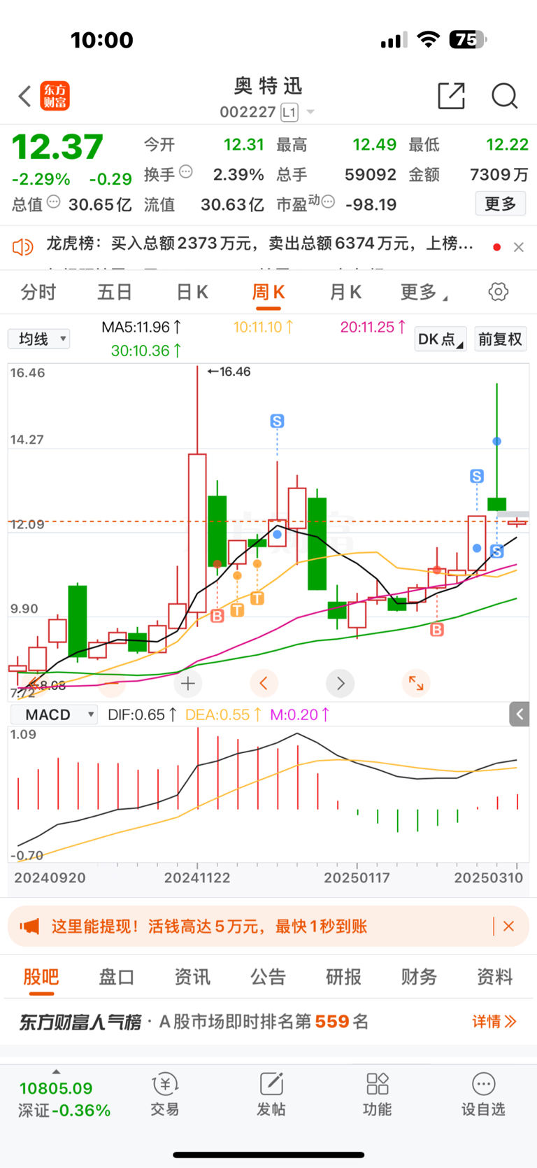 $奥 特 迅(SZ002227)$ 快点下来10.5元我就接回来