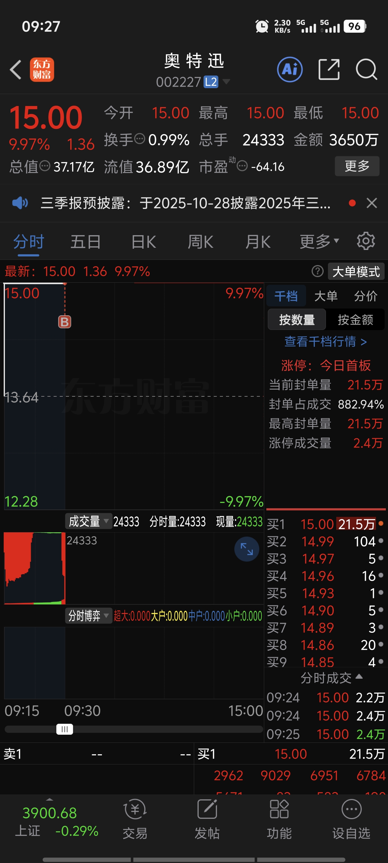 $奥 特 迅(SZ002227)$ 俺又来打板了!希望能成