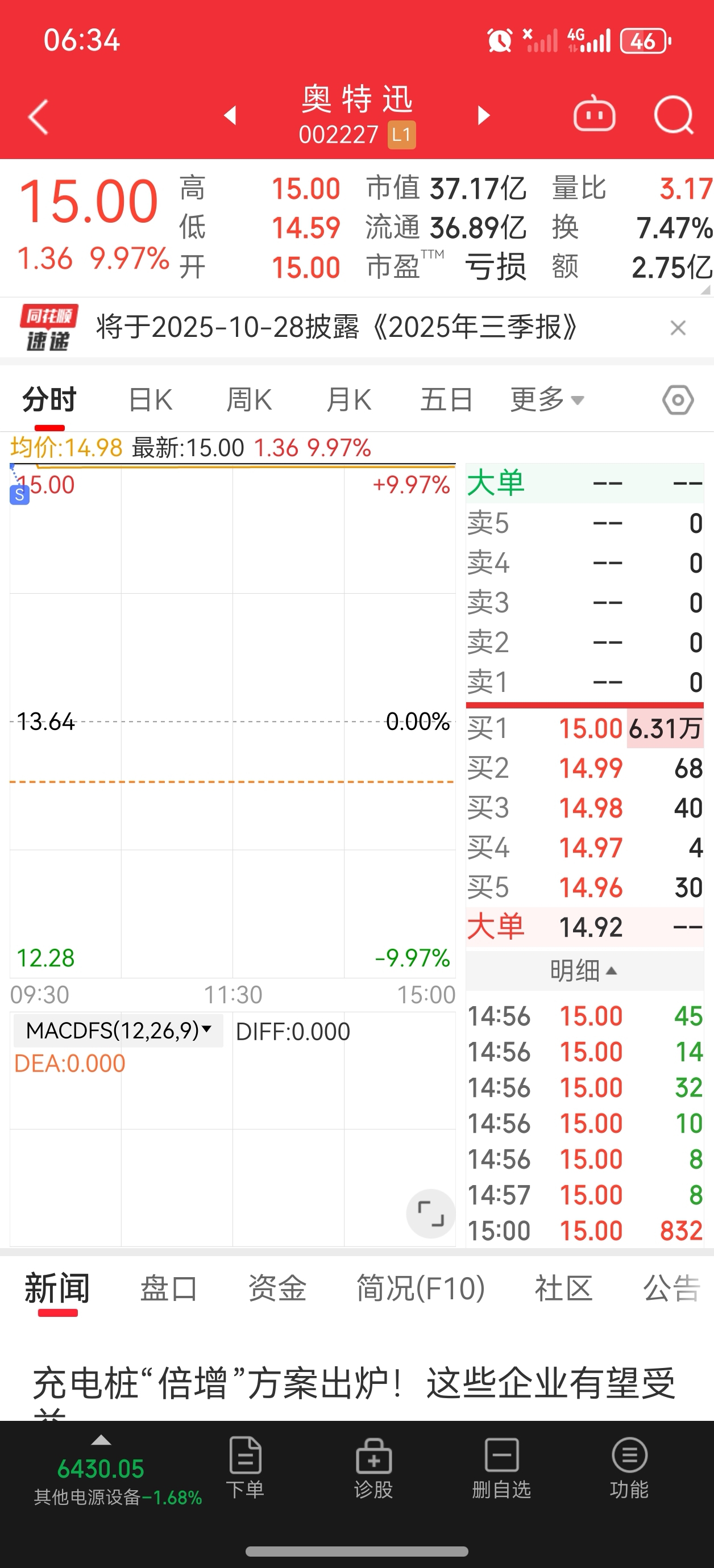 $奥 特 迅(SZ002227)$ 我昨天13.33买入的,今天早上看100多的量,挂15卖出,然后挂14.66买入,没有成交
