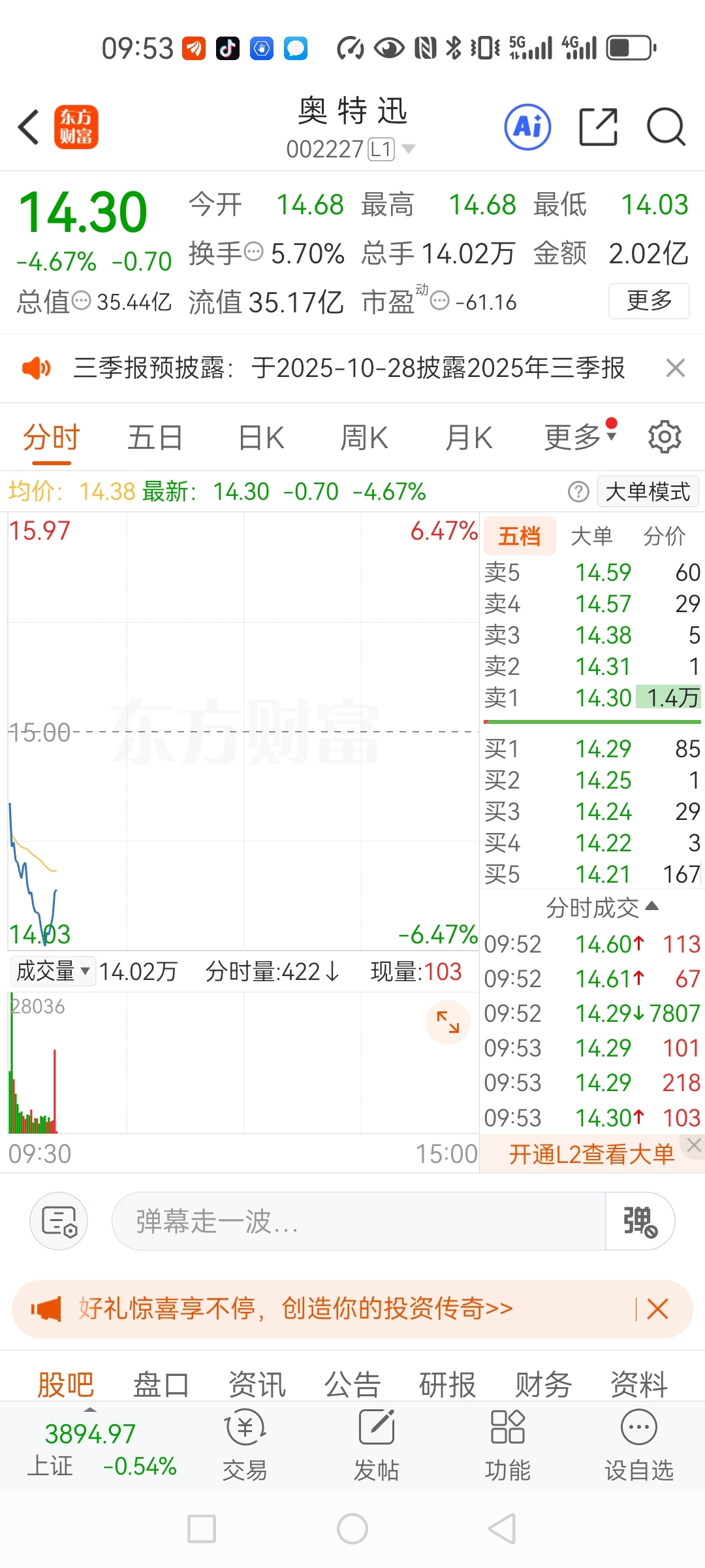 $奥 特 迅(SZ002227)$ 不让拉啊,一个超级大卖单,阻挡了拉的路。