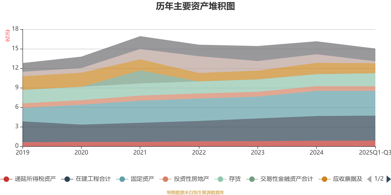资产重大变化方面,截至2025年三季度末,公司货币资金较上年末减少77.78%,占公司总资产比重下降6.24个百分点;在建工程合计较上年末增加0.7%,占公司总资产比重上升1.94个百分点;存货较上年末增加8.31%,占公司总资产比重上升1.89个百分点;固定资产较上年末减少1.62%,占公司总资产比重上升1.37个百分点。