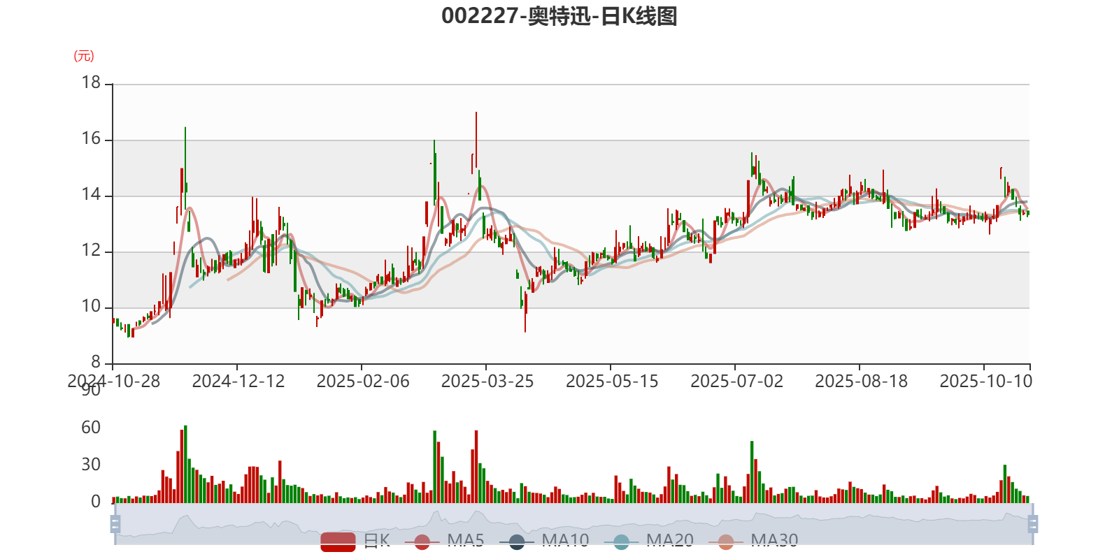 中证智能财讯奥特迅(002227)10月28日披露2025年第三季度报告。前三季度公司实现营业总收入1.84亿元,同比下降17.04%;归母净利润亏损4952.85万元,上年同期亏损2341.34万元;扣非净利润亏损5488.27万元,上年同期亏损3122.56万元;经营活动产生的现金流量净额为-3914.78万元,上年同期为-1920.18万元;报告期内,奥特迅基本每股收益为-0.1999元,加权平均净资产收益率为-5.18%。