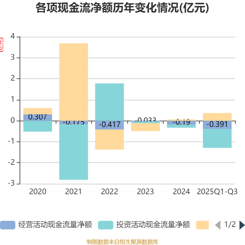 2025年前三季度,公司经营活动现金流净额为-3914.78万元,同比减少1994.6万元;筹资活动现金流净额3674.19万元,同比增加6573.7万元;投资活动现金流净额-9001.21万元,上年同期为-3978.85万元。