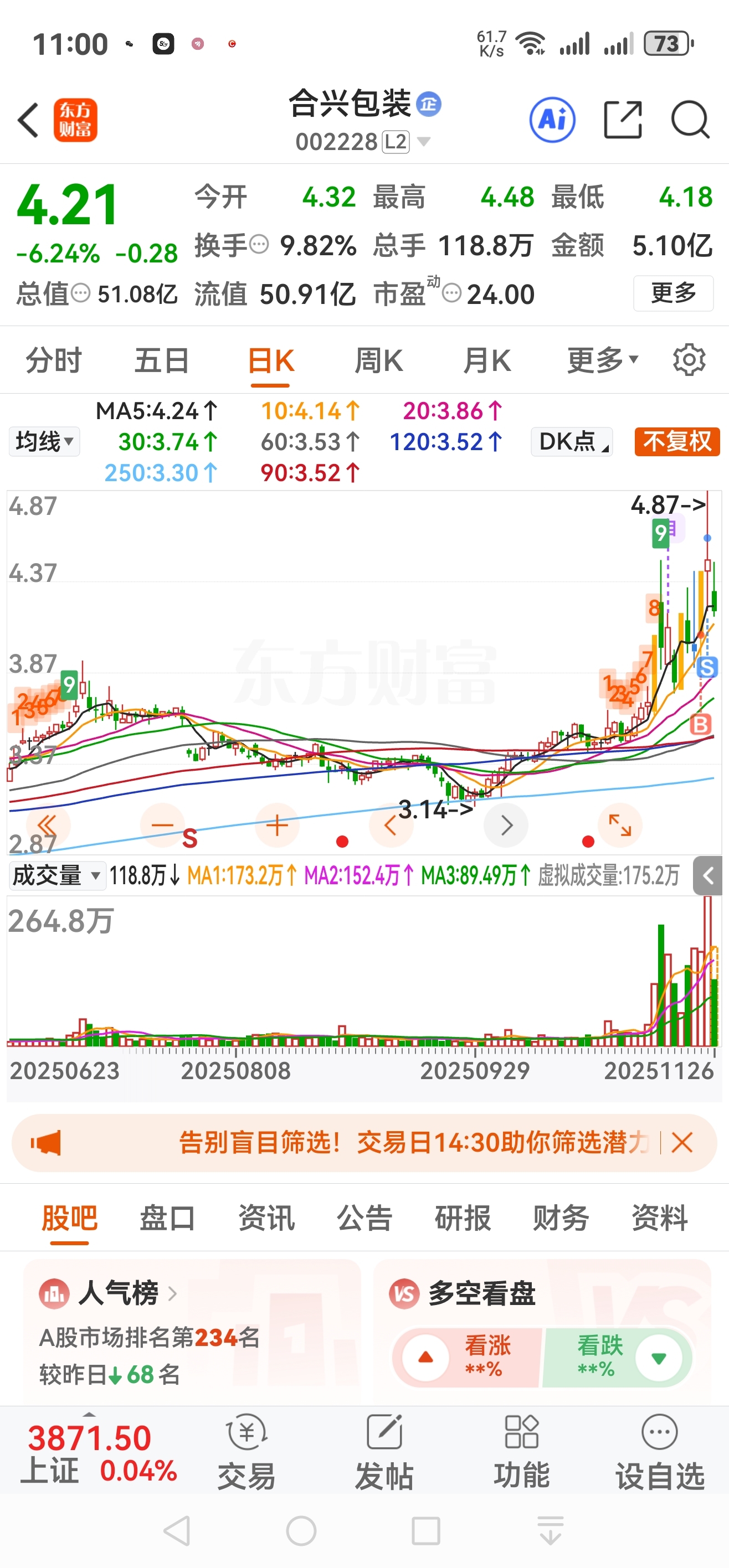 $合兴包装(SZ002228)$ 幸亏昨天跑了