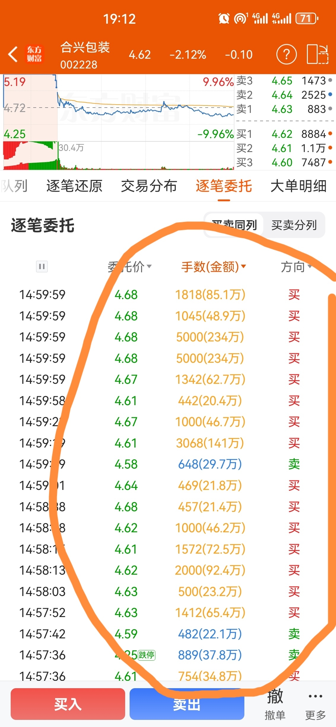 $合兴包装(SZ002228)$ 从尾盘资金委托记录来看,是有想抢筹码的嫌疑,明天高开命炫一注?