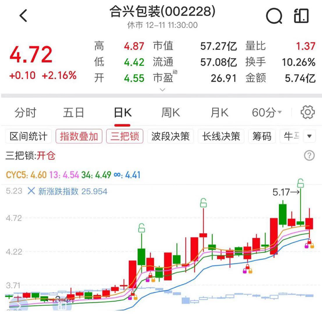 $合兴包装(SZ002228)$ 合兴:三把锁出现了,有机构在买。