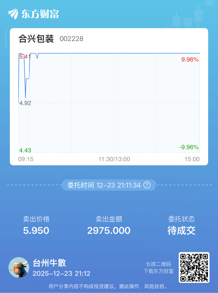 $合兴包装(SZ002228)$ 挂个涨停卖