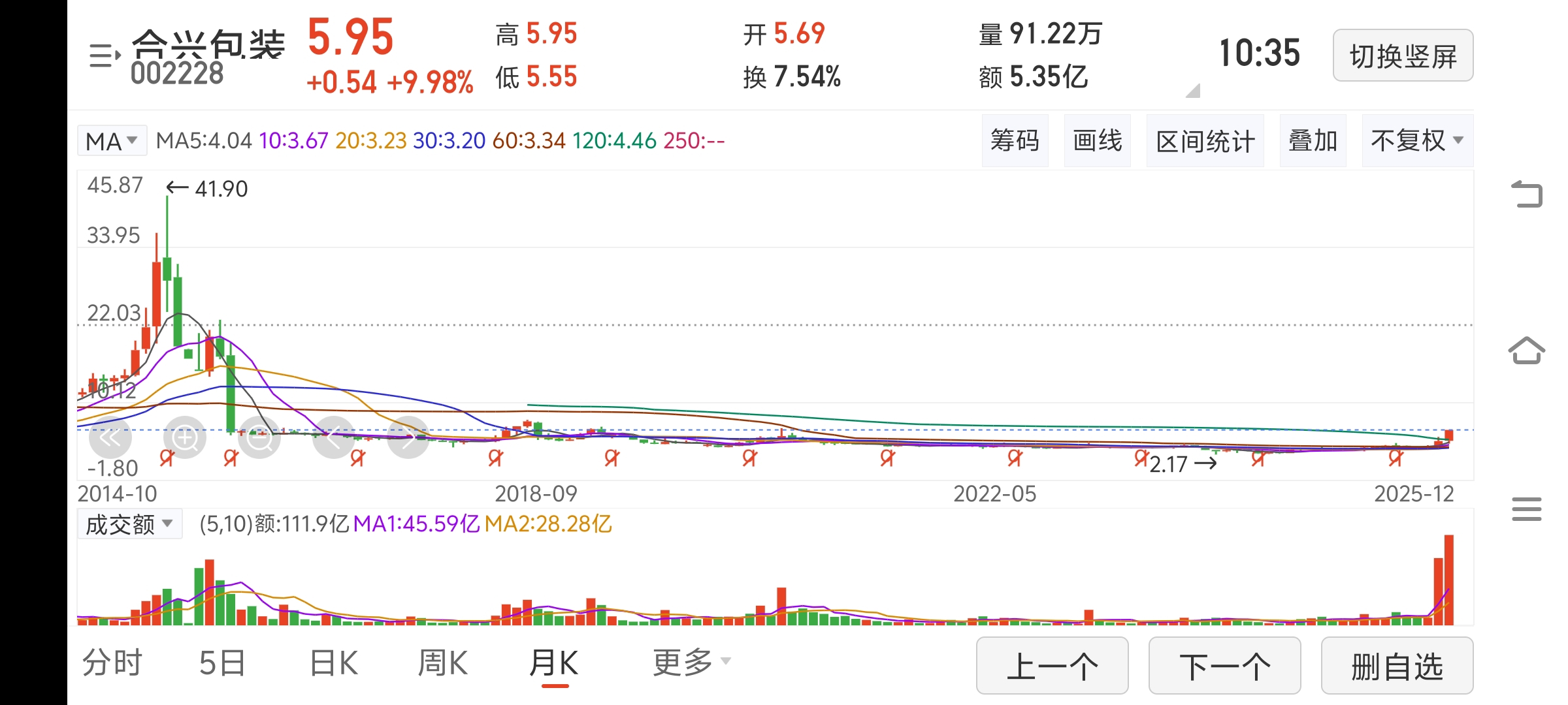 $合兴包装(SZ002228)$ 看这个情况,如此远超前高的成交量,7.48元必破无疑,今天卖了五万股有点后悔了