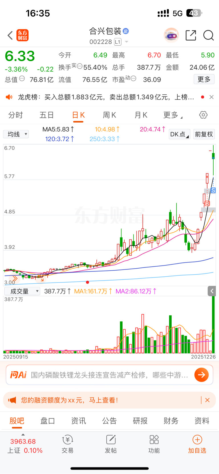 $合兴包装(SZ002228)$ 该强不强就是弱,今天集合竞价不及预期,认知有限,留下的兄弟发财!!!周一竞价不是高开高走奉劝兄弟们赶紧跑!$嘉美包装(SZ002969)$ 这是真龙