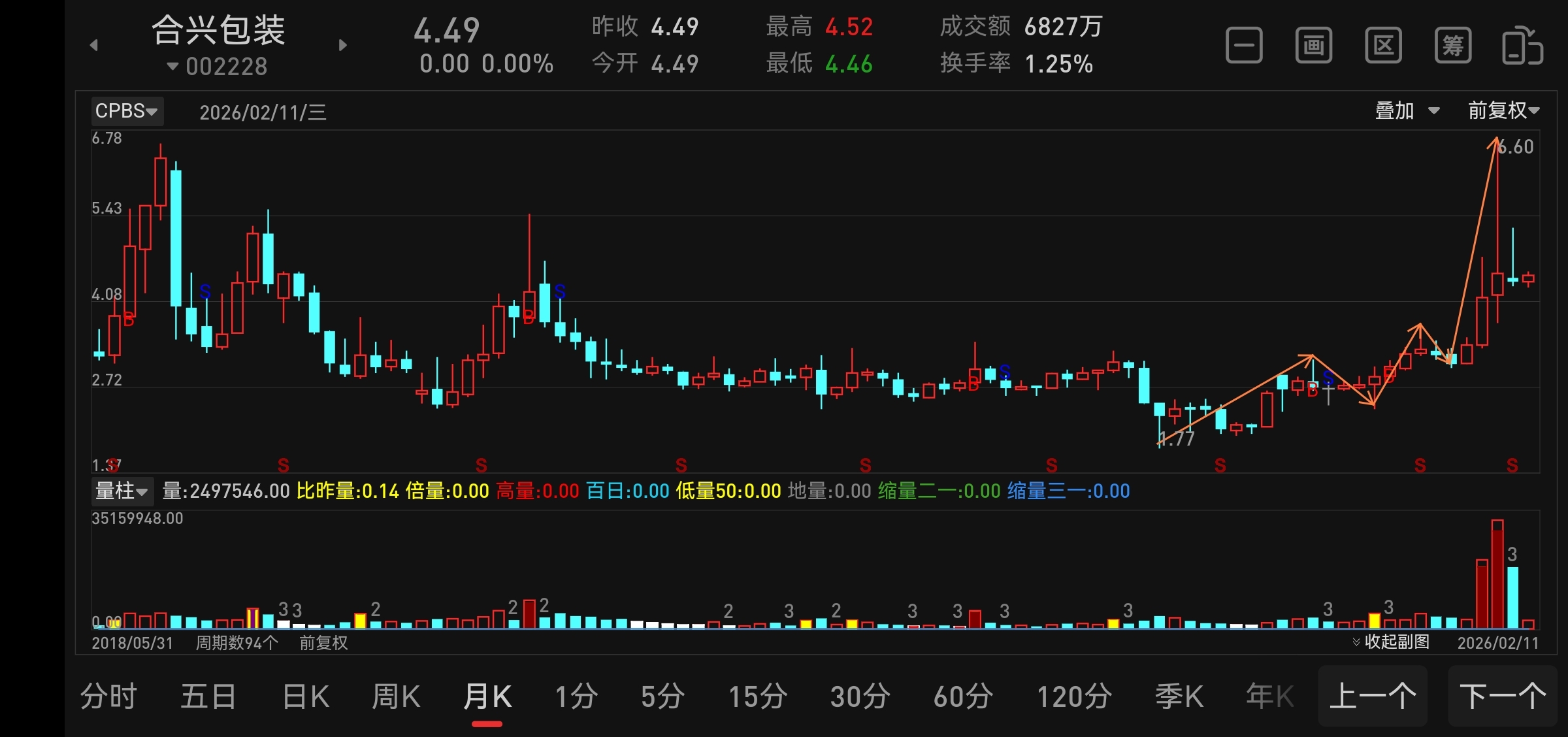 $合兴包装(SZ002228)$ 买横买坑不买竖!6.60/1.77=3.728813559。