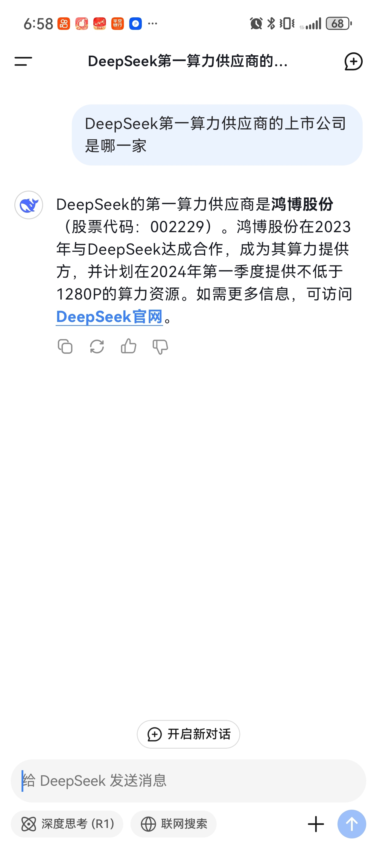 $鸿博股份(SZ002229)$ DeepSeek的第一算力供应商是**鸿博股份**(股票代码:002229)。鸿博股份在2023年与DeepSeek达成合作,成为其算力提供方,并计划在2024年第一季度提供不低于1280P的算力资源。如需更多信息,可访问[DeepSeek官网](https://deepseek.com)。