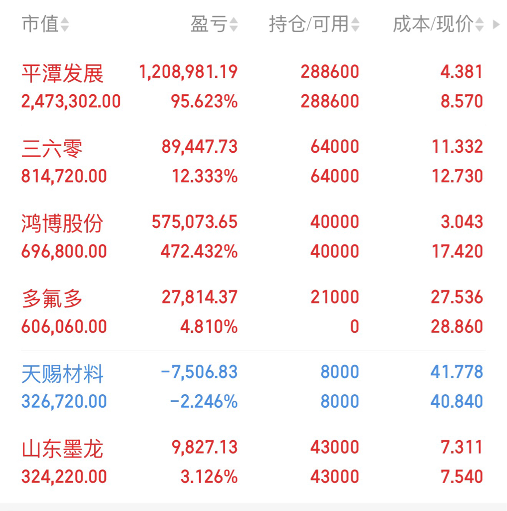 平潭拿着9板真的舒服。鸿博半年不多说继续拿着咯。等着天赐材料扭亏为盈。
