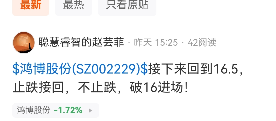 $鸿博股份(SZ002229)$ 昨日判断今日会动16.5止跌,我16.5进场了,跟上我的节奏!