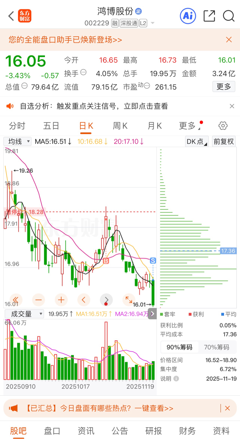 $鸿博股份(SZ002229)$ 18.1买,16.5卖,亏到逼不得已割肉。