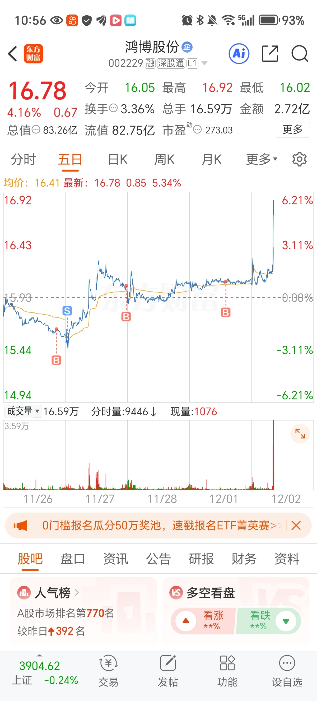 鸿博也开始活跃了,好事!拿稳扶好底部拉升。