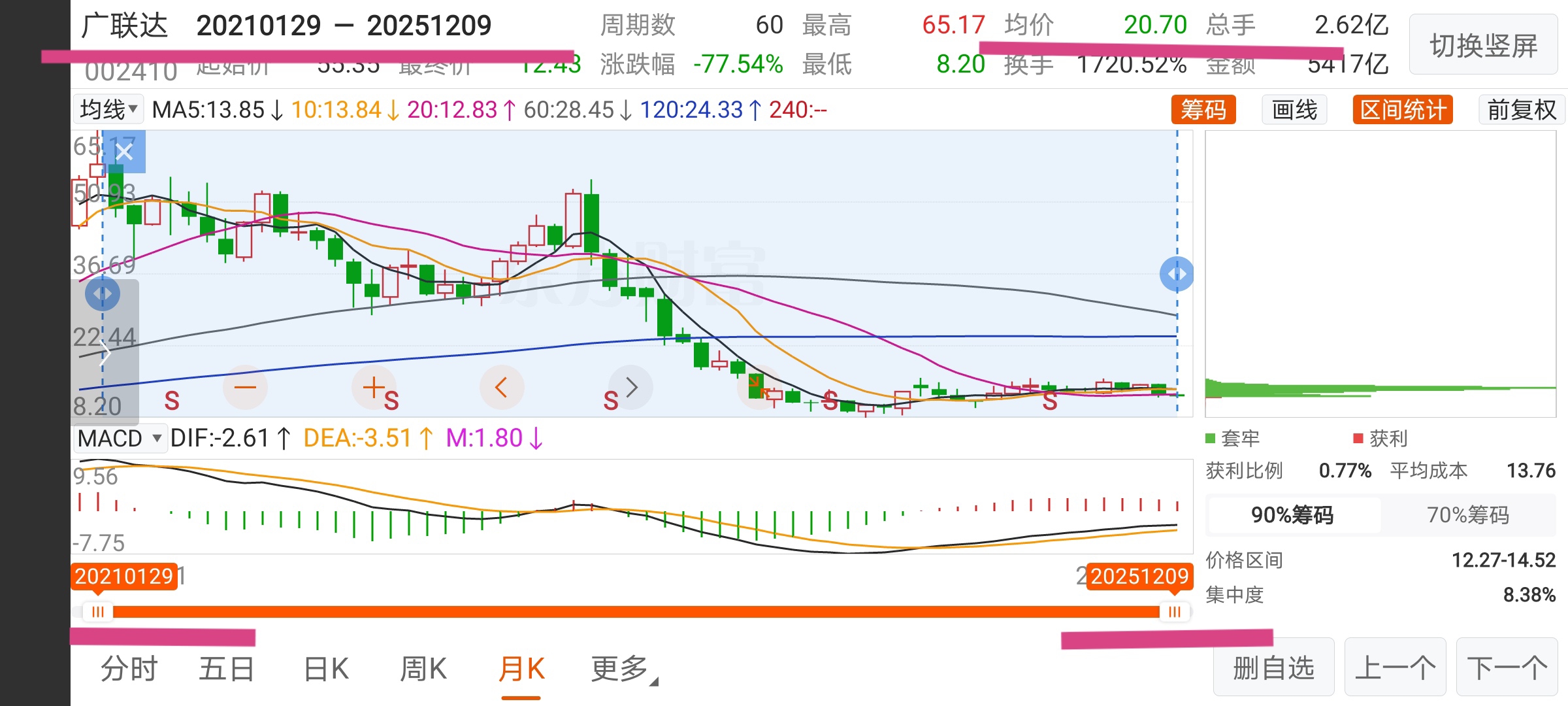广联达从2021年3月至今约四年半运行均价20.10元/股。现股价12.43元/股为近四年半多运行均价的61.84%,总市值205.34亿元。