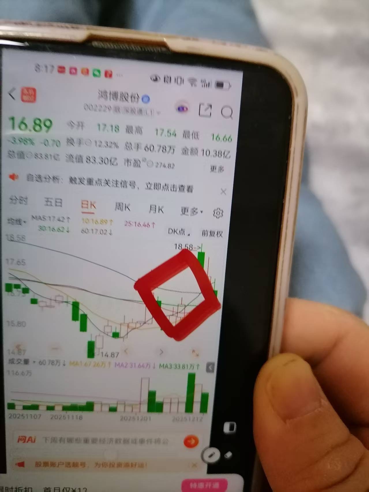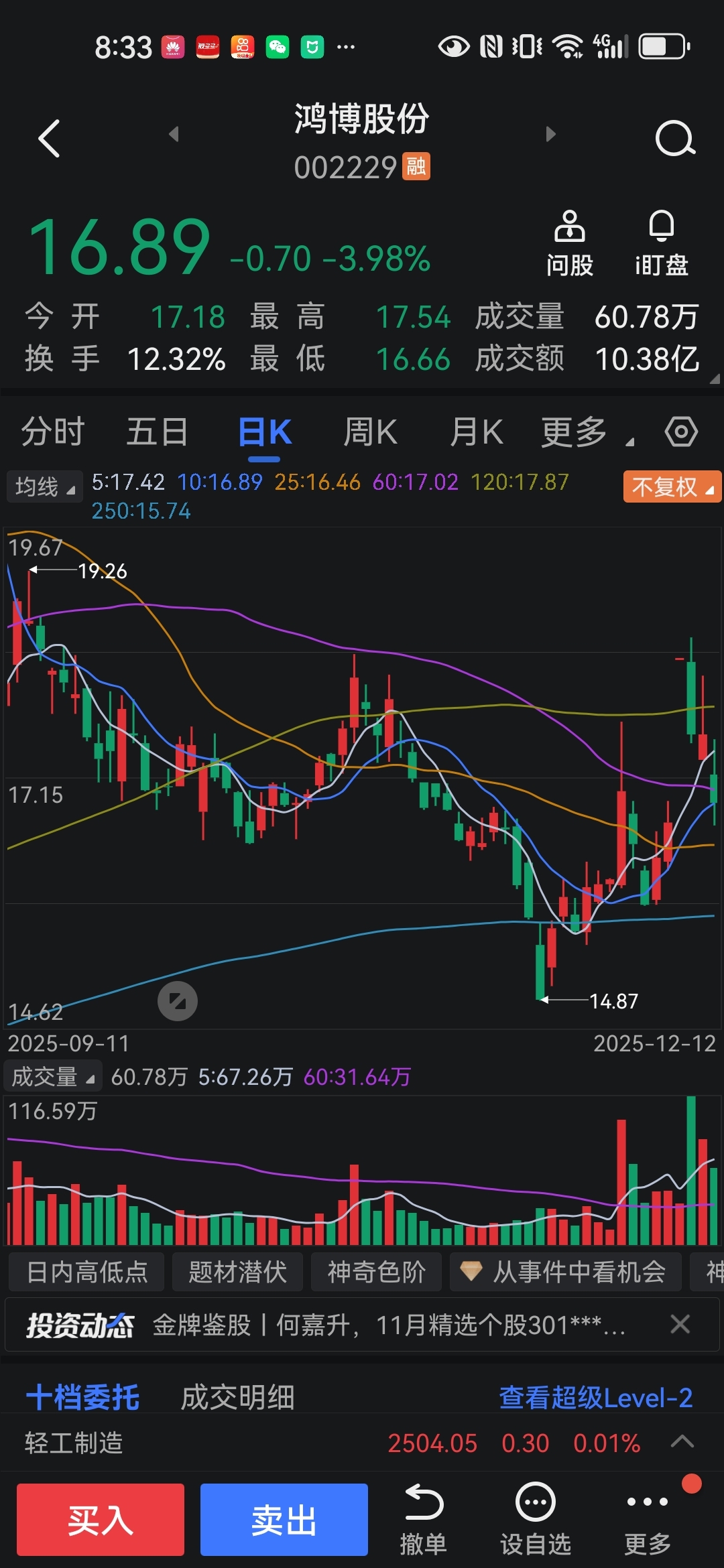$鸿博股份(SZ002229)$ 周一应该是涨的,最近一周走了个菱形洗盘,底部筹码不动,从8月29号成交量放最大,到12月2日放量,8日再放量,下跌几天成交量缩小。今天回踩确认。打到前期支撑位, 从2号到现在换手率一共115%左右,每天都高于5。说明股性活跃。从24元到14.87已经下跌了38%。属于超跌。不知道分析的对不对,周一见证。