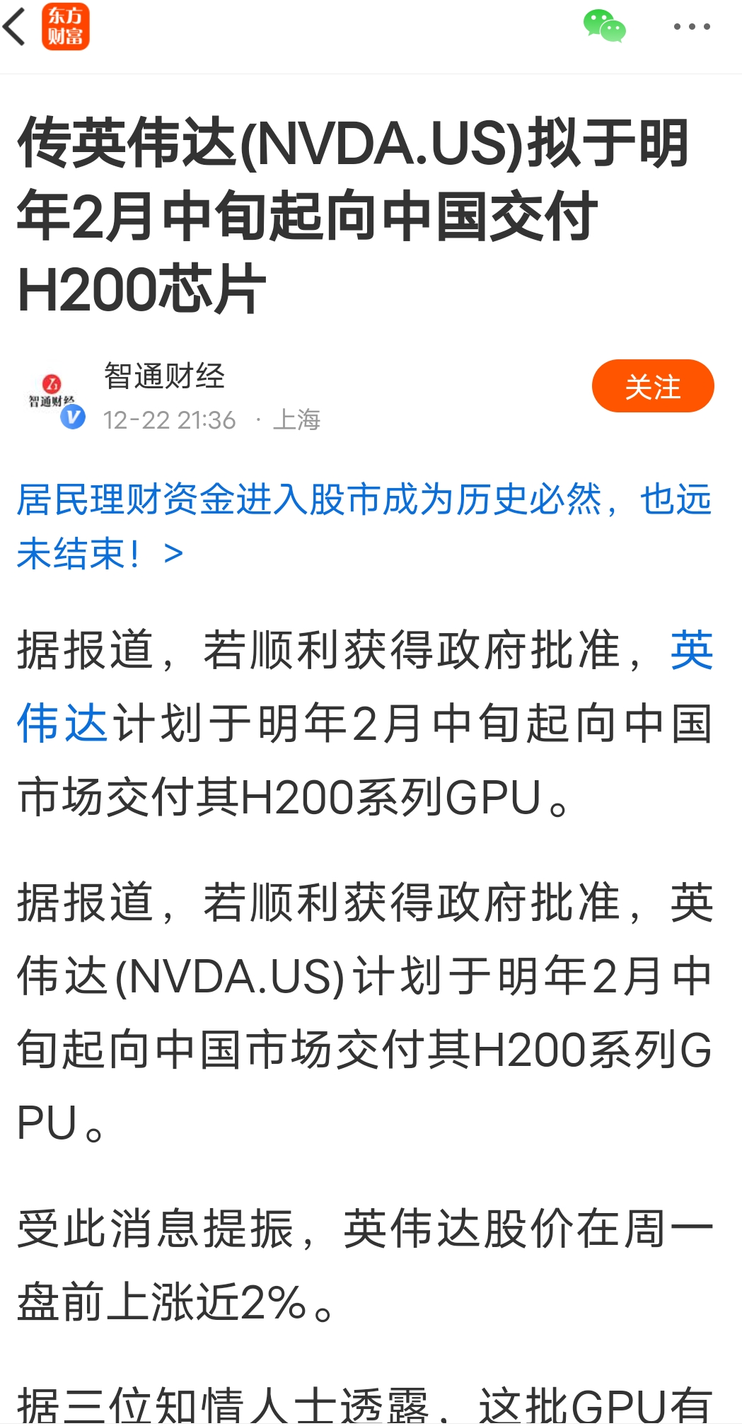 $鸿博股份(SZ002229)$ 据报道,若顺利获得政府批准,英伟达(NVDA.US)计划于明年2月中旬起向中国市场交付其H200系列GPU。