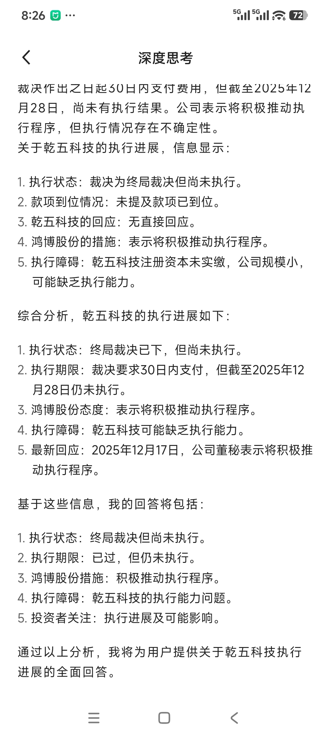 $鸿博股份(SZ002229)$ 关于仲裁判决后,乾五科技的执行进展如何?
