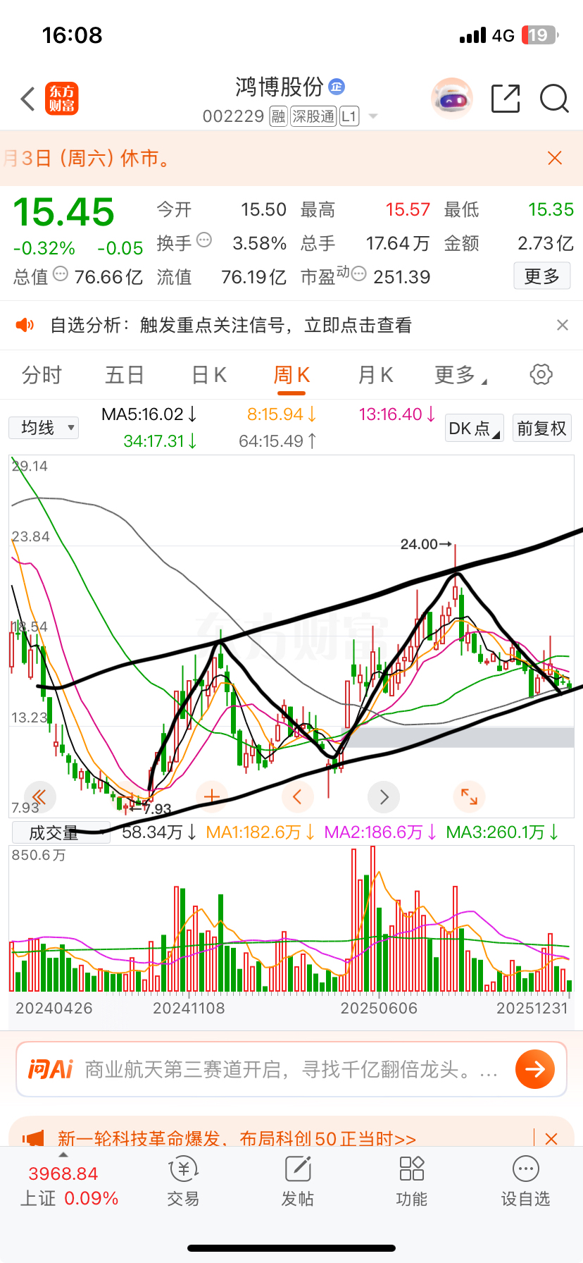 $鸿博股份(SZ002229)$ 按周线级别来看,下面会怎么走,2026敬请期待。