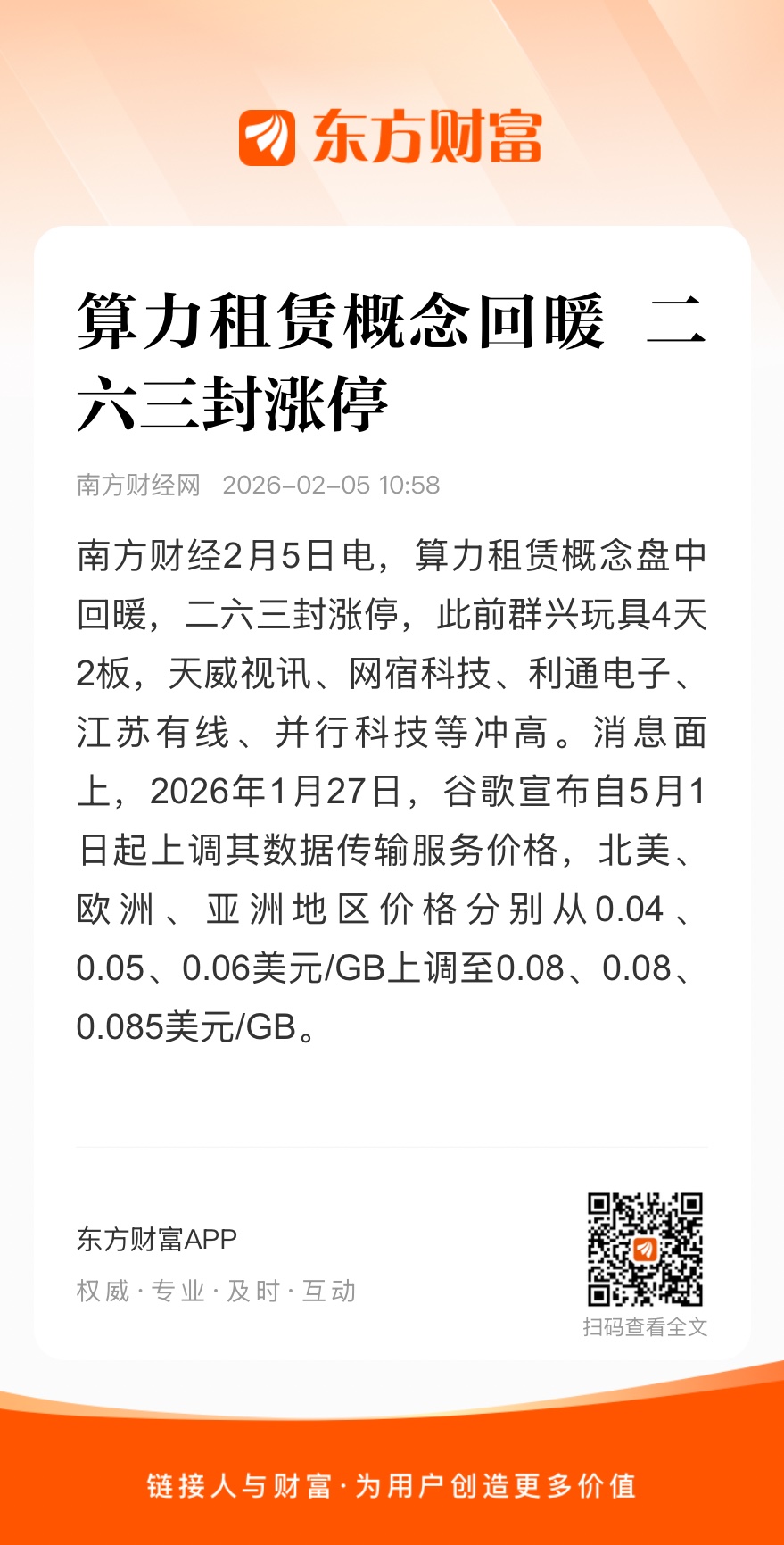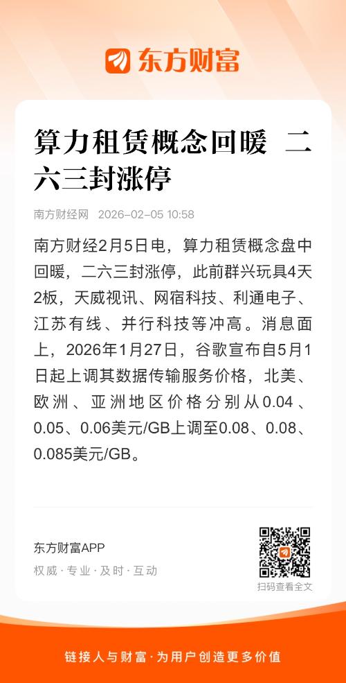 南方财经2月5日电,算力租赁概念盘中回暖,二六三封涨停,此前群兴玩具4天2板,天威视讯、网宿科技、利通电子、江苏有线、并行科技等冲高。消息面上,2026年1月27日,谷歌宣布自5月1日起上调其数据传输服务价格,北美、欧洲、亚洲地区价格分别从0.04、0.05、0.06美元/GB上调至0.08、0.08、0.085美元/GB。