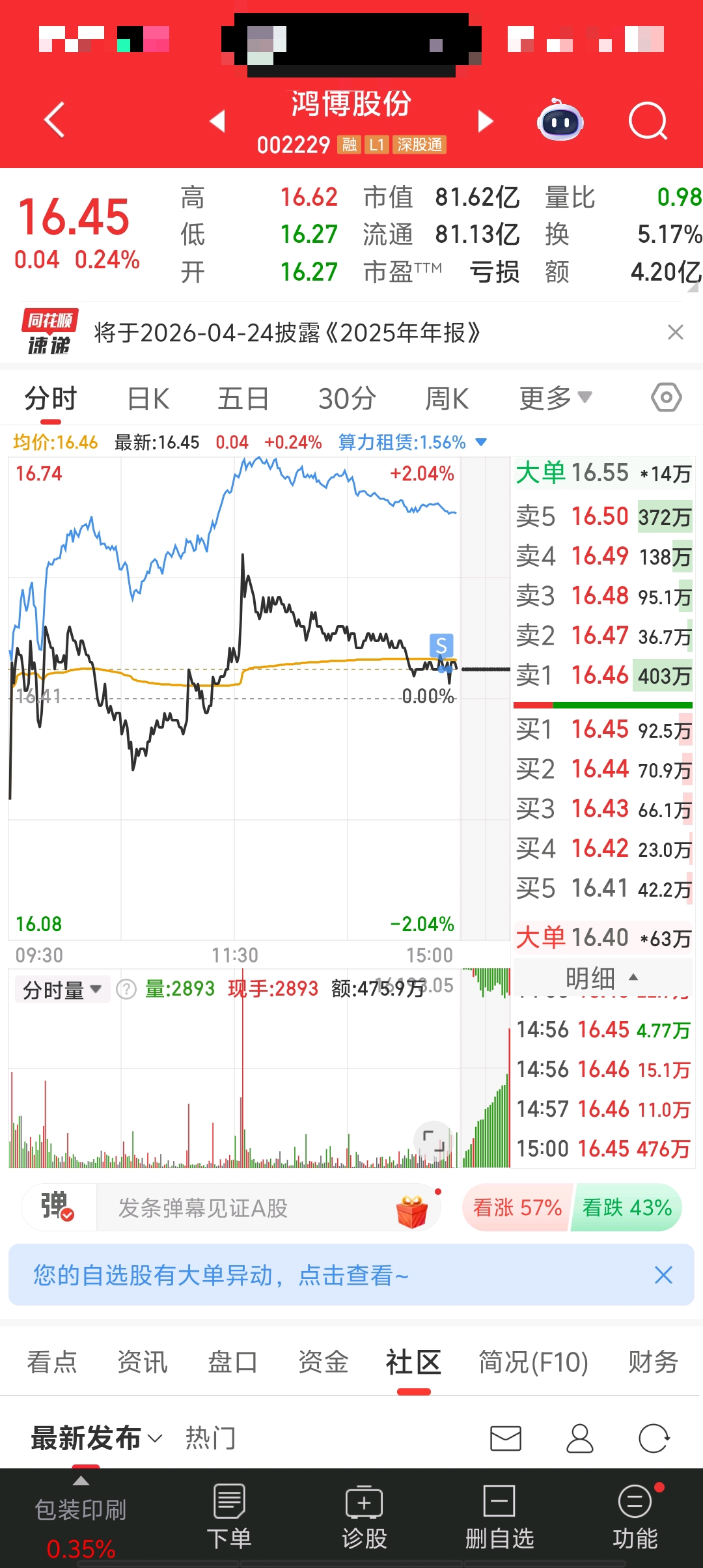 $鸿博股份(SZ002229)$ 老子今天真的卖了!!霉目的主力明天拉个大的给我鸿博的兄弟多赚点!!明天要是跌了我就买回来做t了!!