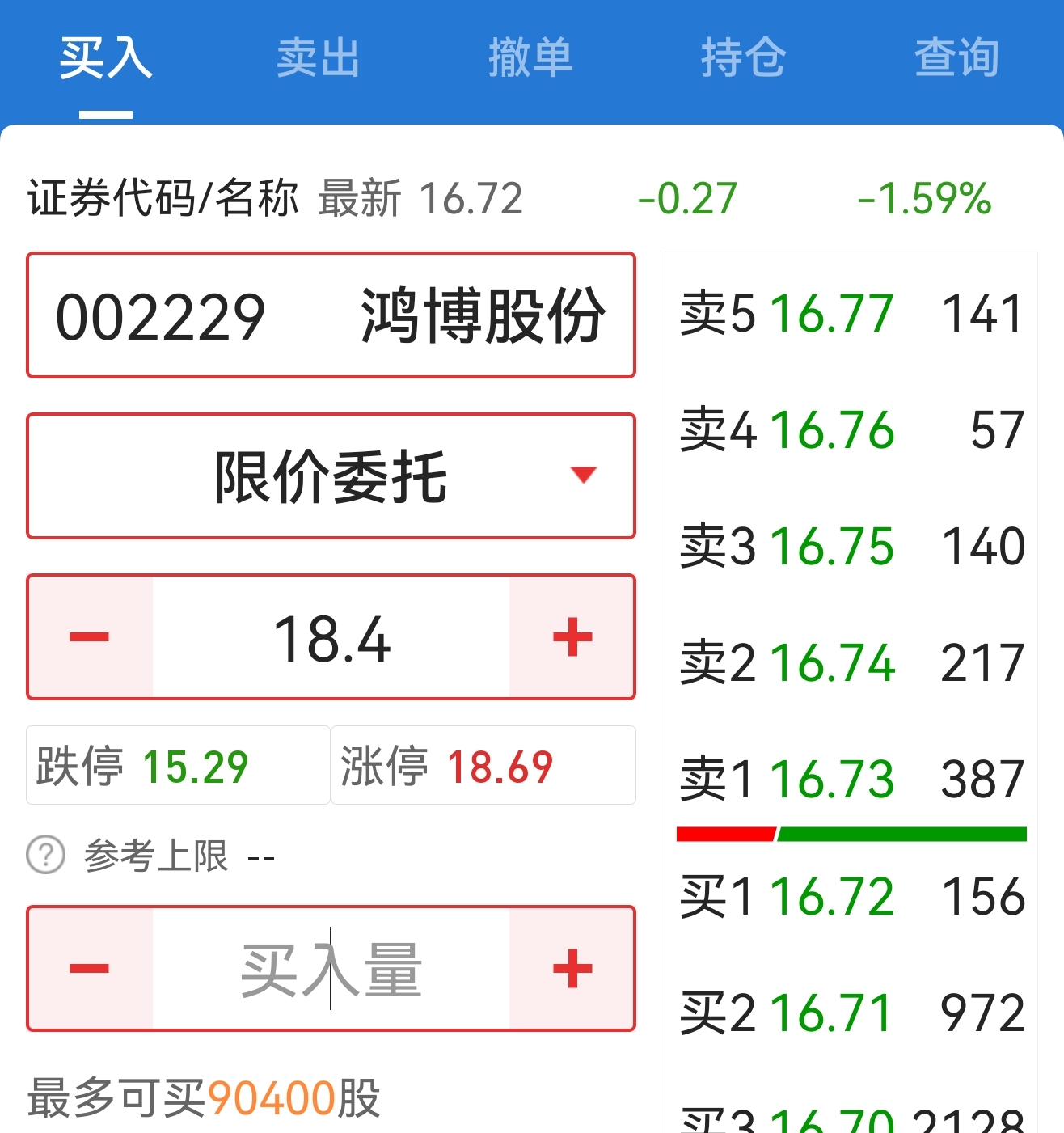 $鸿博股份(SZ002229)$ 以涨停价18.4元申报买入排队了,一共可以买入9万股