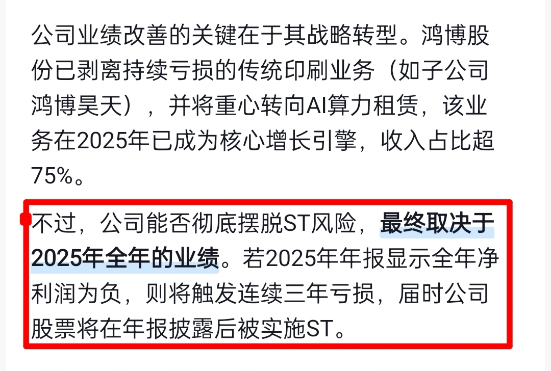 $鸿博股份(SZ002229)$ 这个票从买进来到现在一直亏,越补越套,到现在不敢买,25年的年报预亏43.28~61.72%.如果按这样算的话,就连续亏损触发ST
