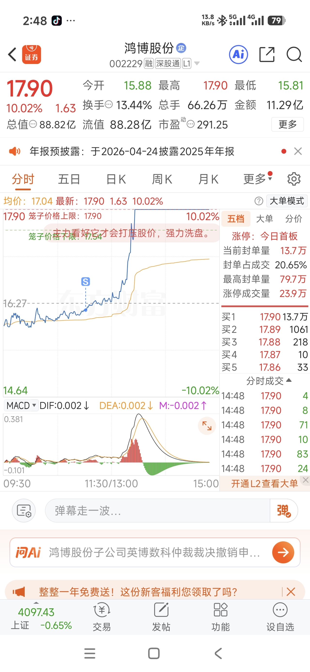 $鸿博股份(SZ002229)$ 我命不由我.......