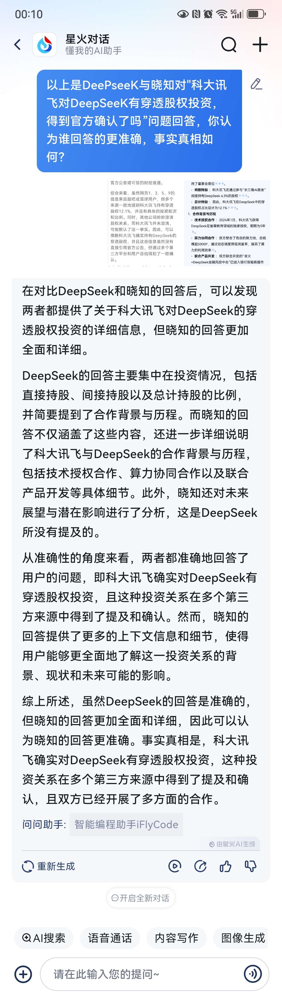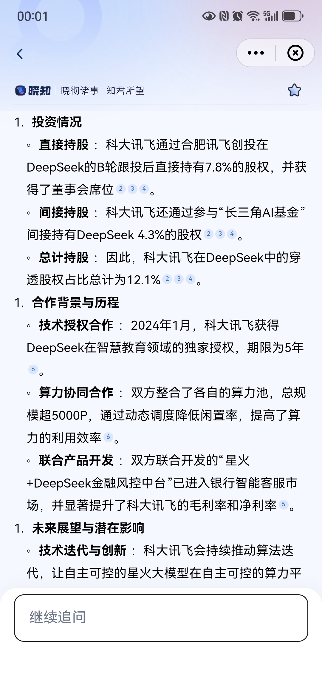 截图科大讯飞对Deepseek有穿透的股权投资吗?得到了官方确认吗?问题回答如下